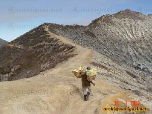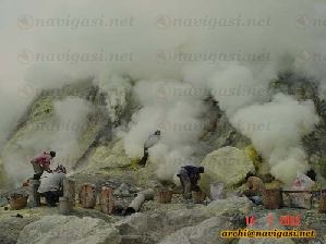 Terkadang bara fumarol menyala tak terkendali, yang biasanya segera disiram air untuk mencegah reaksi piroporik berantai. Batu-batuan belerang ini dipotong dengan linggis dan diangkut kedlm keranjang. Bernapas dlm lingkungan spt. ini dibutuhkan perjuangan tersendiri, para penambang umumnya bekerja sambil menggigit kain sarung atau potongan kain seadanya sebagai penapis udara.