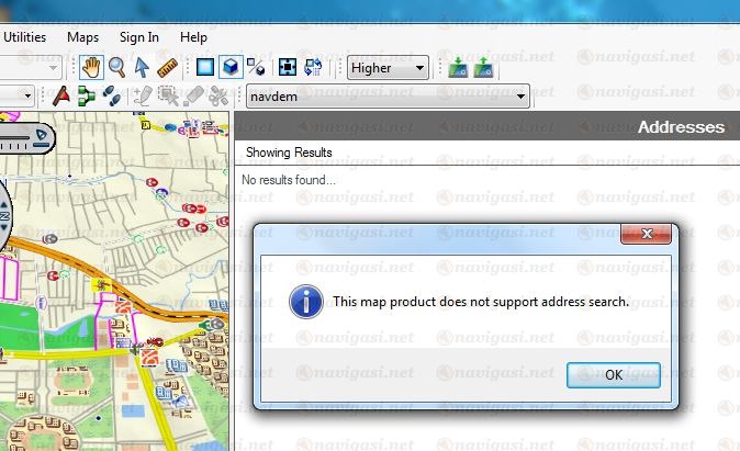 Untuk peta gabungan Navigasi.net 2.34 dan DEM tidak bisa search address
