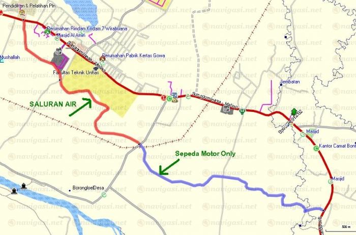 Ubah residential street dari S5.23771 E119.50662 ke S5.24492 E119.52655 menjadi sepeda motor only (jalan inspeksi disamping saluran irigasi)