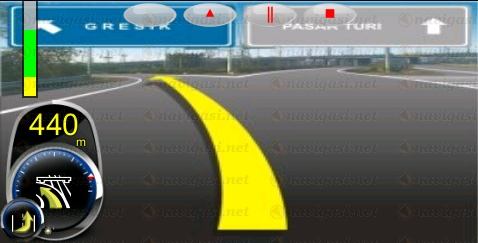 Sekitar 300 meter sebelum ramp, jika ada gambar junction view yagn tampil lagi, maka signpostnya yang ke kiri adalah Gresik, dan yang lurus adalah Pasar Turi. Panah bantuan navigasi seharusnya tergambar lurus ke arah Pasar Turi.