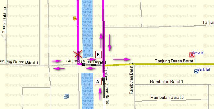 | |  | |  | | | Routing yg salah di Tj Duren Jakbar, dari titik A ke Tj Duren Barat 1 seharusnya bisa langsung belok kiri / kanan. Dari Titik A Tidak Bisa ke Titik B karena ada separator jalan. | |  | |  |