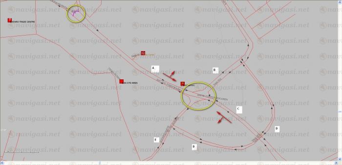 | |  | |  | | | menjadi seperti diatas. Jadi bila dari titik A ingin ke tol akan melalui titik C, sedangkan bila ingin ke titik E, harus melalui jalur B - D - E | |  | |  |