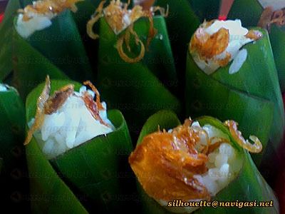 Nasi uduk dibungkus daun pisang dalam ukuran mini dengan beberapa bawang goreng diletakkan dibagian kuncup-nya tampak menarik dilihat. Aroma daun pisang muda yang masih menempel pada nasi uduk saat menyuapnya ke mulut semakin menambah selera. Saya sendiri menghabiskan empat bungkus, karena tak tahan dengan gurihnya nasi bersantan ini. Sebagai lauk, tersedia daging (empal), paru, hati, tempe maupun ayam, pas sekali dipadukan dengannya.
