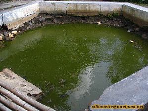 terdapat kolam kecil dengan air berwarna hijau beserta gelegak air