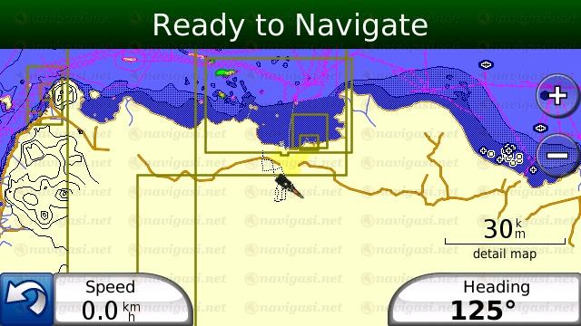 Untuk membuktikan peta NavNet Oom Tepe holic sudah terinstall, bisa dilakukan dengan zoom out maksimum (1000km atau lebih), lalu geser ke wilayah indonesia dan zoom in pada wilayah Jawa/Jakarta. Maka akan tampak peta NavNet berikut icon-iconnya yg colorful.