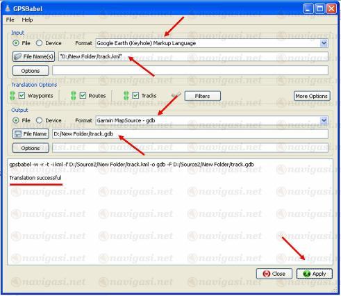 pada 'Output' pilih File Format: Garmin Mapsource - gdb lalu tentukan nama file outputnnya, Apply.