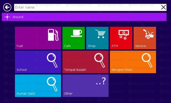 Pada menu search PLACE berdasarkan kategori POI tidak hanya kategori standar saja yg bisa ditampilan (Fuel, Cafe, Shop, ATM, Service, Other),tetapi kategori lain pun bisa ditambahkan sesuai kebutuhan (Sekolah, Rumah Sakit, Bengkel Mobil, Tambal Ban, dll) dengan cara mengedit file GUI.XML.