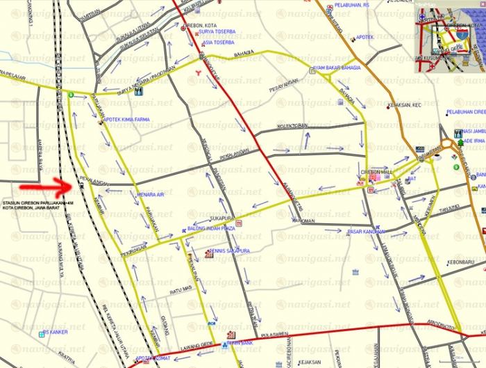 sebagai patokan awal, anda bisa mulai dari STASIUN CIREBON PARUJAKAN +4M (S6 43.159 E108 33.522) yang saya beri tanda panah merah atau dari posisi S6 43.082 E108 33.870