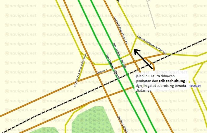 | |  | |  | | | seharusnya tdk ada node yg tersambung antara u-turn yg berada dibawahnya jembatan dan Jl gatot Subroto yg berada diatas jembatan | |  | |  |