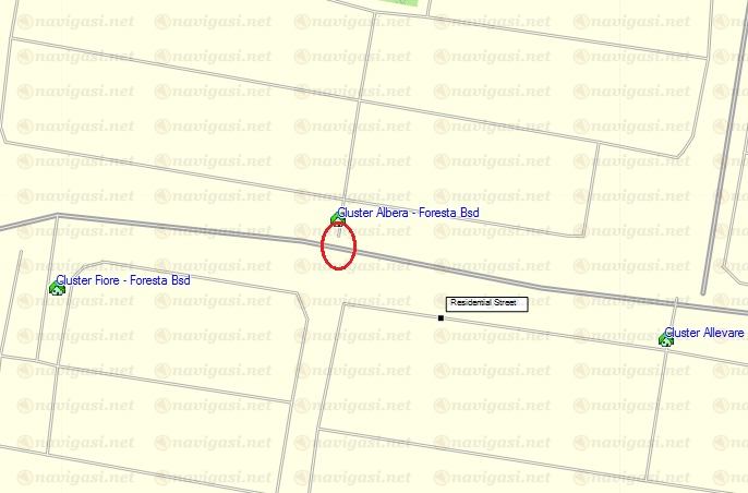 Jalan masuk Cluster Albera - Foresta BSD tidak nyambung dengan jalan raya (lingkaran merah), jadi tidak bisa routing dari luar cluster ke dalam cluster.