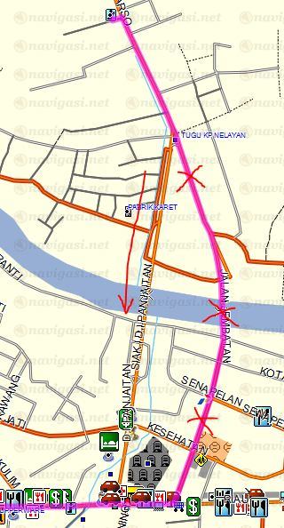 Kesalahan ada pada titik N0 32.336 E101 26.207 sampai N0 32.297 E101 26.202, seharusnya ruas jalan tsb masih bisa 2 arah.