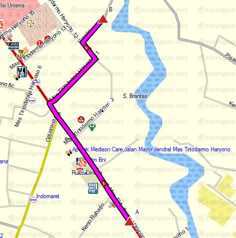 Routing dari titik S7.94587 E112.61227 (titik A, Jl. MT Haryono) ke titik S7.94039 E112.61156 (titik B, Jl. Vinolia) oleh mapsource dilewatkan gang yang lebih kecil, padahal seharusnya lewat MT Haryono 9 yang jalannya lebar.