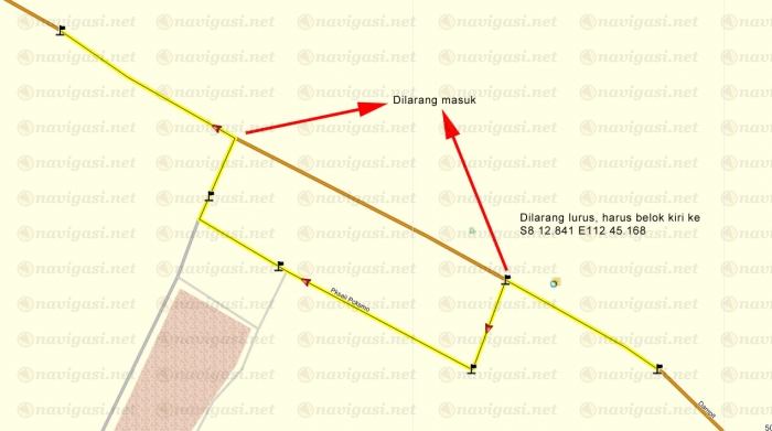 jadi berbeloklah ke kiri (mulai: S8 12.815 E112 45.180 ; S8 12.845 E112 45.150 ; S8 12.776 E112 45.020 )