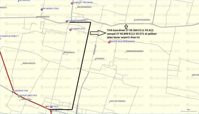 Titik Koordinat S7 39.366 E111 55.912 sampai S7 40.899 E111 55.571 Dari desa Kecubung sampai Pace Kab. Nganjuk sudah di jadikan jalan besar (alternatif) dan bisa jd jln penghubung antara yang lintas dr kediri ke lintas dr kertosono.(Pict Terlampir)