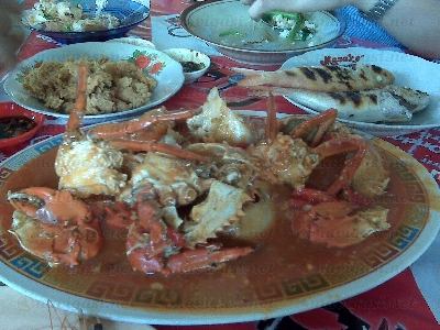 beberapa menu coba dipesan, ikan kerisi bakar; jika anda mengharap rasa gurih atau sedap dari menu ini, anda harus siap-siap kecewa karena ikan ini benar-benar dimasak "plain", ikan ini baru berasa jika kita cocolkan dengan sambal yang tersedia, ada dua macam sambal kecap dan semacam tauco. Menu lain standard seafood, cumi goreng tepung dan udang rebus hanya sebagai variasi menu tidak ada yang terlalu istimewa. dan makan siang itu ditutup dengan menu utama kepiting saus padang. Rasa sausnya pas bagi saya karena tidak terlalu dominan rasa kunyitnya seperti yang biasa ada di masakan padang. Dan untuk menghilangkan rasa pedas, es jeruk kunci adalah pilihan yang pas, tidak terlalu asam dan punya aroma yang khas.