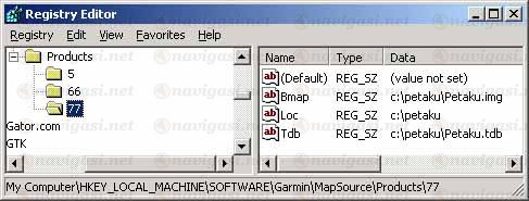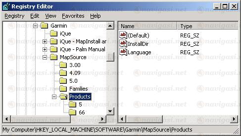 "HKEY_LOCAL_MACHINE\Software\Garmin\MapSource\Products". Sebagai