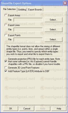 Pada bagian "File Selections" beri centang "Export Areas/ Export Lines/ Export Points dan masing2 beri nama file sesuai yg diinginkan. Maaf jika saya keliru.