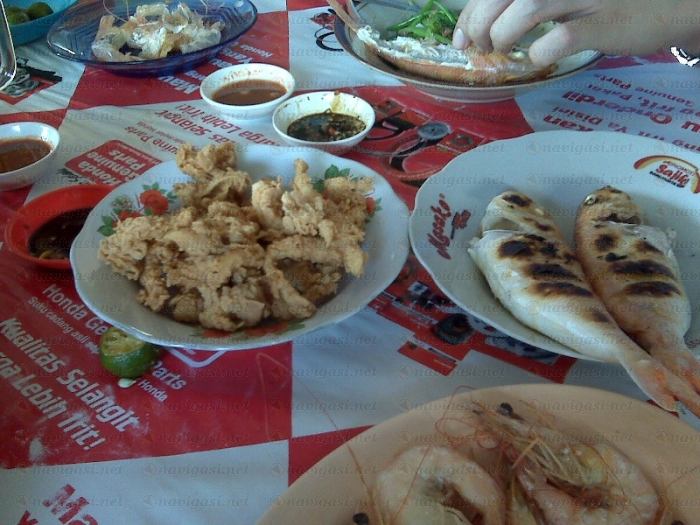 beberapa menu coba dipesan, ikan kerisi bakar; jika anda mengharap rasa gurih atau sedap dari menu ini, anda harus siap-siap kecewa karena ikan ini benar-benar dimasak "plain", ikan ini baru berasa jika kita cocolkan dengan sambal yang tersedia, ada dua macam sambal kecap dan semacam tauco. Menu lain standard seafood, cumi goreng tepung dan udang rebus hanya sebagai variasi menu tidak ada yang terlalu istimewa. dan makan siang itu ditutup dengan menu utama kepiting saus padang. Rasa sausnya pas bagi saya karena tidak terlalu dominan rasa kunyitnya seperti yang biasa ada di masakan padang. Dan untuk menghilangkan rasa pedas, es jeruk kunci adalah pilihan yang pas, tidak terlalu asam dan punya aroma yang khas.